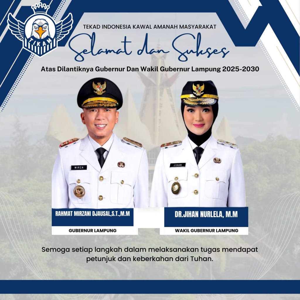 Ahmad Risqi Rinanda selaku Ketua Umum Tekad Indonesia Kawal Amanah Masyarakat(Tikam) Mengucapkan Selamat atas pelantikan Gubernur Lampung yang biasa disapa Yai Mirza itu.