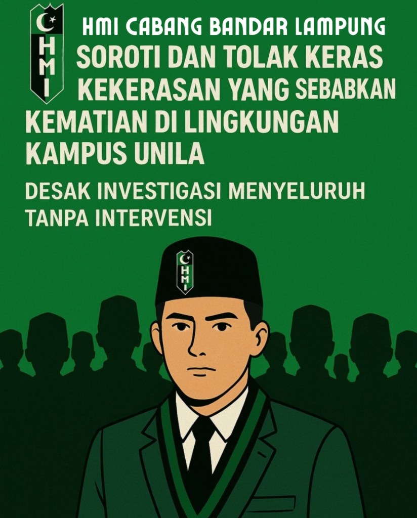 Bandar Lampung, 4 Juni 2025 — Himpunan Mahasiswa Islam (HMI) Cabang Bandar Lampung menyatakan sikap tegas terhadap dugaan kasus kekerasan yang terjadi di lingkungan Universitas Lampung (Unila) yang baru-baru ini menyebabkan kematian seorang mahasiswa. Kejadian ini menimbulkan duka mendalam dan mengundang keprihatinan serius dari berbagai pihak, termasuk organisasi kemahasiswaan.